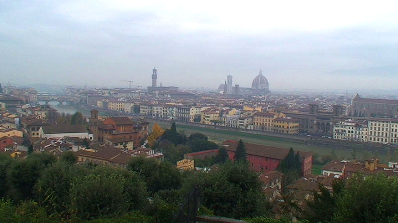 To Purchase this video as a DVD or as a 720p HD Download, please click here. A Detailed Description of the Virtual Walk on this Video![]() Your 60 minute Florence Walking Tour begins in Piazzale Michelangelo, with its breathtaking view of the city of Florence. ![]() You turn, pass by a small cafe, and begin a long walk... ![]() down the beautiful tree-lined ramp beside the Viale Giuseppe Poggi. ![]() At the bottom of the hill, you pass through the Porta San Miniato, built in 1320, and a part of the city walls of Florence. ![]() Once inside the walls, you first follow the Via S. Miniato... ![]() then the Via di S. Niccolo. ![]() then one more turn and across the Ponte alle Grazie... ![]() where the camera turns and pauses to take in the view of the Arno River and the Ponte Vecchio in the distance. ![]() Next, we walk to Via de' Cerretani and the Duomo of Florence. ![]() The camera pauses to look up at the magnificence of the Duomo... ![]() and Brunelleschi's famous dome. ![]() The camera turns towards the Baptistry and the famous Gates of Paradise, by Lorenzo Ghiberti. ![]() Walking to the rear of the Duomo, you discover a copy of Michaelangeo's David in the Piazza del Duomo. ![]() Next, walking down the Via dei Servi, we come to... ![]() the Basilica della Santissima Annunziata, a Renaissance-style basilica... ![]() whose construction was begun in 1469 and completed in 1481. ![]() Then you walk down a street almost unchanged since Medieval times... ![]() until you enter the Piazza della Repubblica where... ![]() the street market has typical Italian cheeses... ![]() and meats, among other things for sale. ![]() Leaving the street market, we pass a colorful Italian carousel... ![]() and walk toward the Piazza della Signoria... ![]() the focal point of the city of Florence and the political hub of the city. ![]() We first turn and walk up the steps and between the famous Medici lions... ![]() and into the Loggia dei Lanzi, an open-air sculpture gallery of antique and Renaissance art. ![]() After pausing to admire some of the Renaissance sculpture, we leave the Loggia dei Lanzi and... ![]() walk over to the Palazzo Vecchio and, on the right, admire Bartolommeo Bandinelli's Hercules and Cacus... ![]() and on the left is a reproduction of Michelangelo's statue, David. The real statue stood in this spot from 1504 to 1873. Today, the original is housed in the Accademia di Belle Arti Firenze. ![]() We next pass through the heavy doors and into the First Courtyard of the Palazzo Vecchio... ![]() and the camera looks up to admire the intricately painted ceiling vaults. ![]() And in this niche inside the First Courtyard stands Samson and Philistine by Pierino da Vinci. ![]() Even the columns are intricately stuccoed. ![]() Before leaving the Palazzo Vecchio, we stop to admire the copy of the Putto with Dolphin fountain by Verrocchio. ![]() Once back in the Piazza della Signoria, we walk over to the famous Fountain of Neptune by Bartolomeo Ammannati. ![]() Then we turn and walk through the Piazzale degli Uffizi and past the famous Uffizi Gallery, one of the most prominent art museums in the world and open to the public since 1765. ![]() At the far end, we leave the Piazzale degli Uffizi and... ![]() Then, after crossing a narrow street, we pause to view the Arno River and the Ponte Vecchio. ![]() Walking through the archways toward the Ponte Vecchio... ![]() and once there, we take a quick look at the Florentine gold jewelry on display. ![]() After walking across the Ponte Vecchio, we turn left and follow the Arno River eastward a short distance before... ![]() turning down an interesting alleyway, passing a sidewalk cafe and... ![]() discovering another narrow street, seemingly unchanged since the Middle Ages. ![]() Next we walk to the expansive Piazza di Santa Croce and its famous Basilica di Santa Croce, the principal Franciscan church in Florence. ![]() The Basilica is the largest Franciscan church in the world and contains the tombs of Machiavelli, Michelangelo and Galileo. ![]() After pausing to view the Statue of Dante Alighieri, Florence's most famous son... ![]() and the richly carved doors of Santa Croce... ![]() your 60 minute Florence Walking Tour ends with this view of the Arno River.